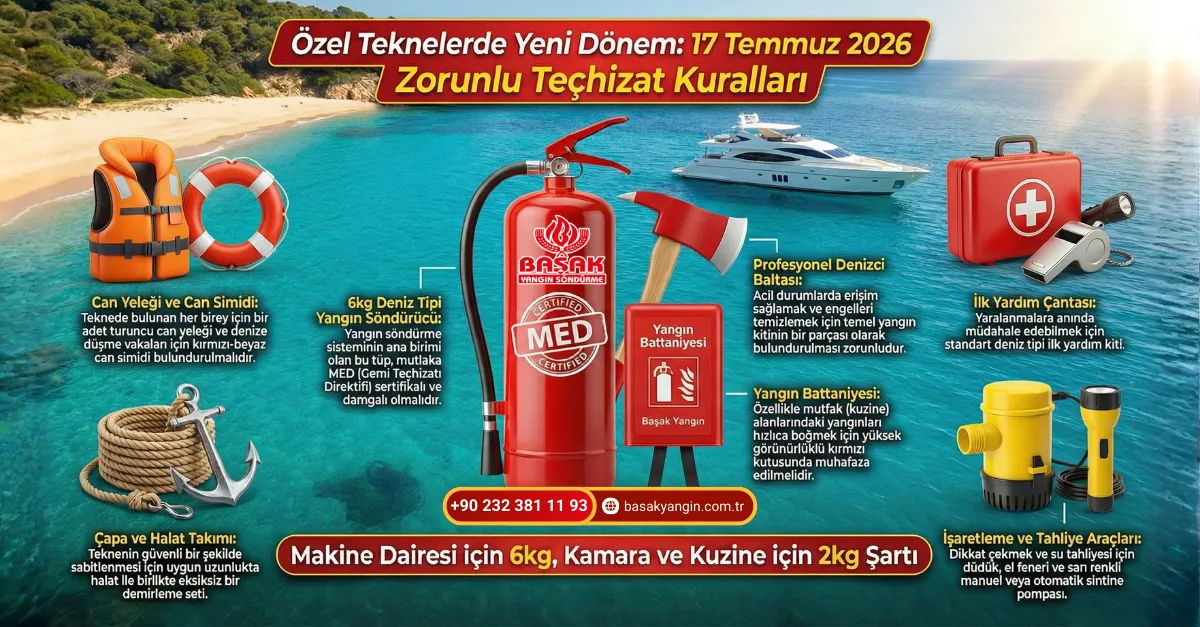 2026 denizcilik mevzuatı,başak yangın,EK-2 asgari emniyet teçhizatı,lityum iyon Hydrogel,MED sertifikalı yangın söndürücü,özel tekne yangın tüpü,tekne yangın baltası,yangın battaniyesi